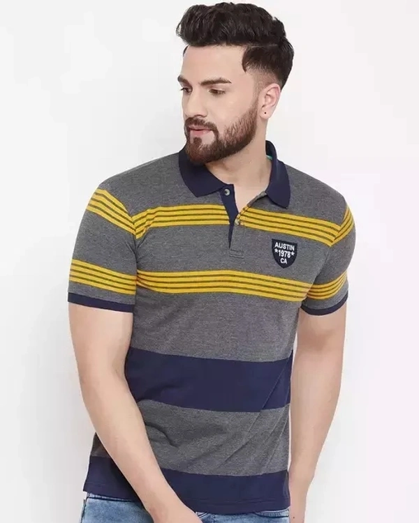 Name : Austin Wood Men's Grey Striped Polo Neck T-shirt-Plus Size Also Available